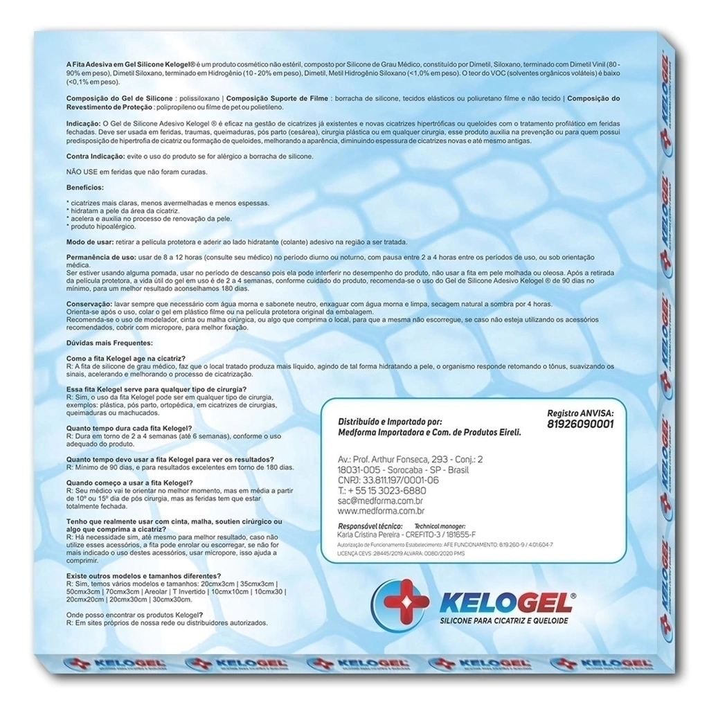 Indicação: O Gel de Silicone Adesivo Kelogel ®️ é eficaz no gerenciamento de cicatrizes, cicatrizes hipertróficas ou queloides com o tratamento profilático em feridas fechadas. Deve ser usada em feridas, traumas, queimaduras, pós-parto (cesárea), cirurgia plástica ou em qualquer cirurgia, esse produto auxilia na prevenção ou para quem possui predisposição de hipertrofia de cicatriz ou formação de queloides, melhorando a aparência, diminuindo espessura de cicatrizes novas e até mesmo antigas.