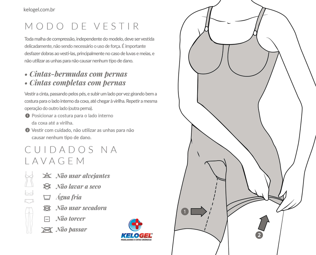 Lavar com sabão neutro, não torcer, secar a sobra, lavar a mão (em máquina as fibras de compressão são deterioradas com mais rapidez, não usar). Ajustar respeitando a saúde do seu corpo.